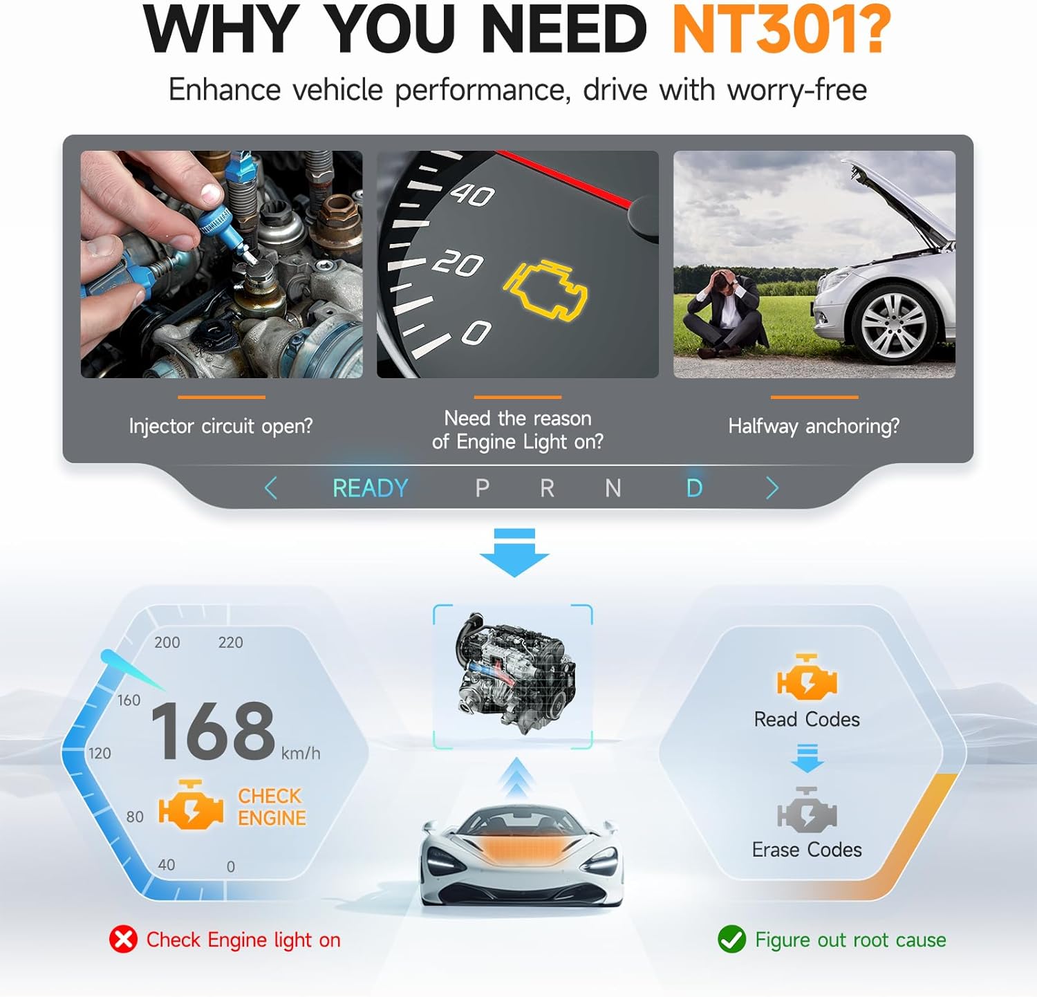 - [Vehicle CEL Doctor] The NT301 obd2 scanner enables you to read DTCs. access to I/M readiness status. figure out the root reason of check engine light or MIL turned on. monitor sensors test. read live data and retrieve VIN of your vehicle. The fault code only can be cleared after repair finished by NT301. as like all the obd2 code readers' working principle